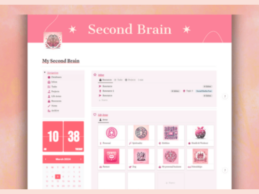 Discover the ultimate organization solution with our SECOND BRAIN Notion Template in a captivating Pink Aesthetic, thoughtfully designed following the acclaimed PARA method. Simplify your digital life effortlessly by navigating through the user-friendly navigation bar, seamlessly accessing databases. Add a personal touch by incorporating your images, data, and information effortlessly. Take control of your digital space and enhance productivity by utilizing the template from the intuitive DASHBOARD. Elevate your Notion experience with this visually appealing and functional Pink Aesthetic SECOND BRAIN template – organization has never been this stylish and straightforward!